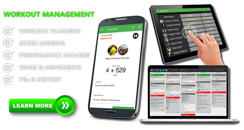 Create the workout plan with preconfigured exercises and WODS. Associate movements and videos. Score logging (individual, pairs, teams, time, reps, rounds + reps, etc.).